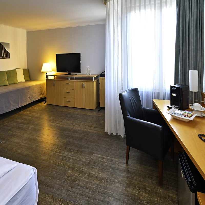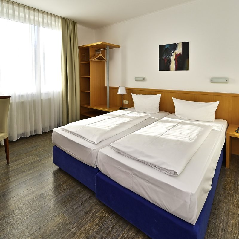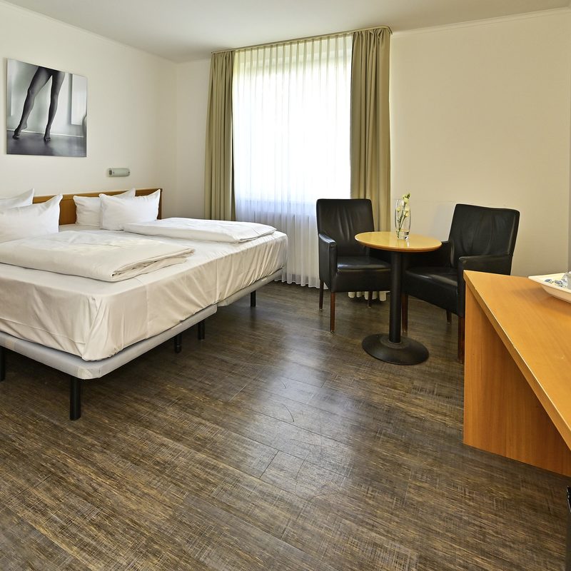 Standard Zimmer: Doppel- und Einzelzimmer, Bad / Dusche / Fön, Flatscreen TV, Schreibtisch, Kofferablage, einige Zimmer mit Verbindungstür als Familienzimmer geeignet.